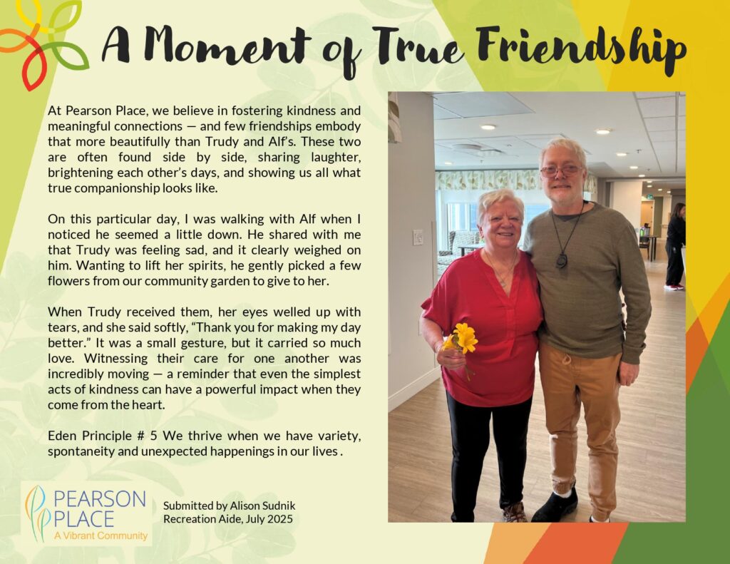This beautiful moment reflects Eden Principle 3, which teaches us that we thrive when we have easy access to the companionship we desire. In fostering connections like these, we combat loneliness and nurture the well-being of everyone involved.