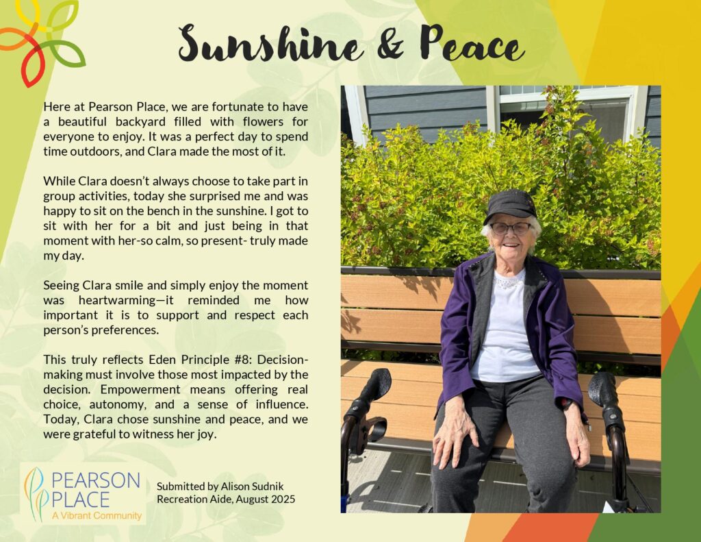Welcome to Pearson Place, where we prioritize not just care, but connection. As families navigate the journey of finding the ideal home for their beloved family members, we understand the importance of a nurturing environment that fosters genuine relationships and meaningful experiences. That’s why we proudly embrace the Eden Alternative®—a philosophy that redefines the traditional approach to eldercare.