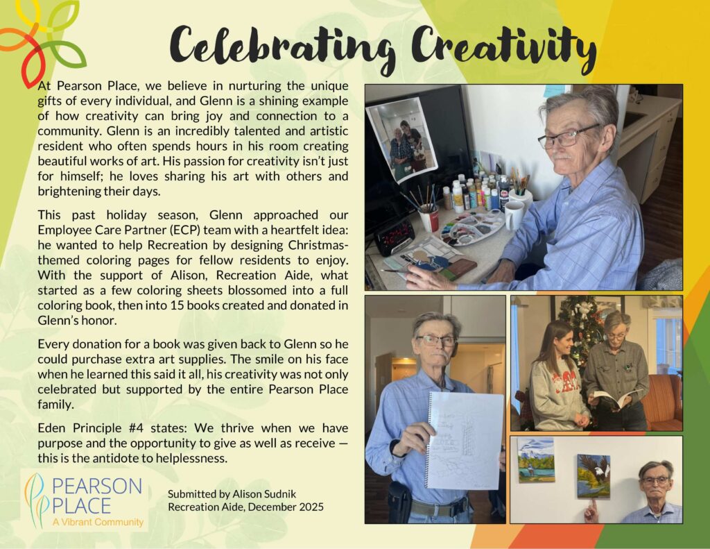 The Eden Alternative® is not just a model; it’s a way of life within our community. At Pearson Place, we believe that every individual, regardless of age or ability, deserves a life filled with purpose, joy, and dignity. The Eden Alternative® emphasizes this belief by creating environments where residents actively participate in decision-making, engage in meaningful activities, and form deep connections with others.
